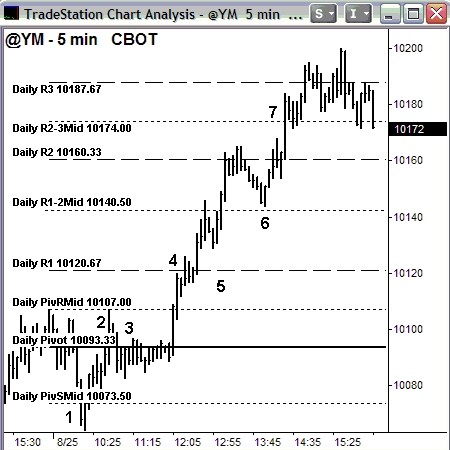 Dado que se ha perforado al alza el pivot situado en 10093.33 (redondeado a 10093), situamos una orden de compra en 10096 a fin de entrar en el pullback. La orden se ejecuta (punto 3) y situamos un stop de compra en 10076. El mercado pierde ritmo durante una hora hasta que retoma la senda alcista y alcanzamos el primer objetivo situado en 10104, donde deshacemos la mitad de la posición y subimos el stop a 10090. Posteriormente cerramos el resto de la posición a 10118 (punto 4).