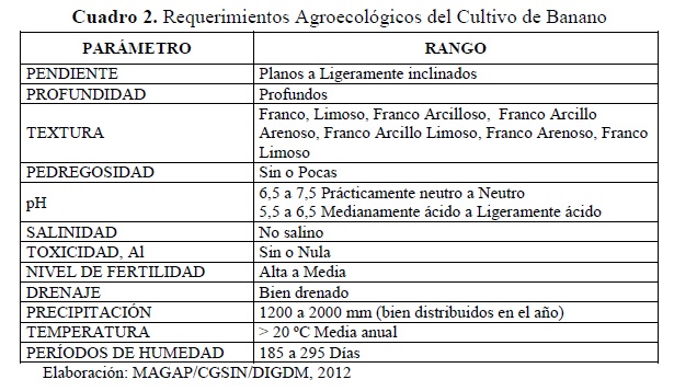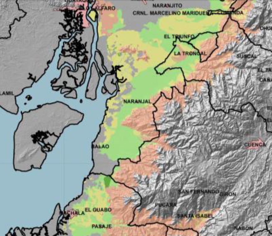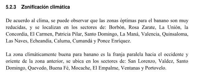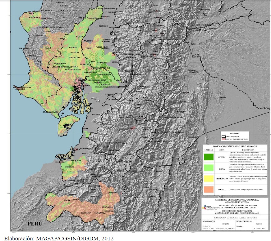 El MAGAP ha desarrollado un estudio sobre las zonas óptimas, buenas y restringidas del cultivo de banano,lo he resumido en dos parámetros: Clima y suelo,en consecuencia tenemos dos mapas, el primero la naturaleza es favorable todo el año, el segundo requiere agricultura de precisión con riego tecnificado.