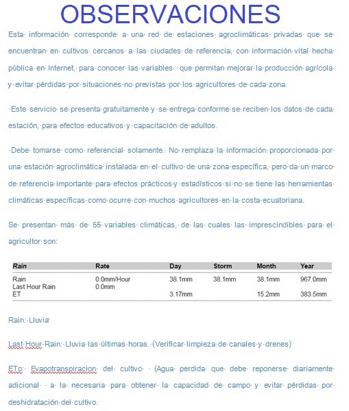 La forma más completa de conocer el clima de la costa ecuatoriana,región,ET0,GPS,sismología,otros ............Un servicio para los agricultores y profesionales del campo…....... Proporcionado gratuitamente por Biotech Global..............Velando por su protección familiar y cultivos.