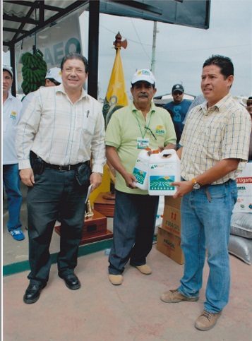 Rey Banano 2011. En la Gráfica el Ing. José Oñate B.,Mg. hace entrega de Viosil (Silicio Líquido) al Ing. Agr. Darwin Palacios