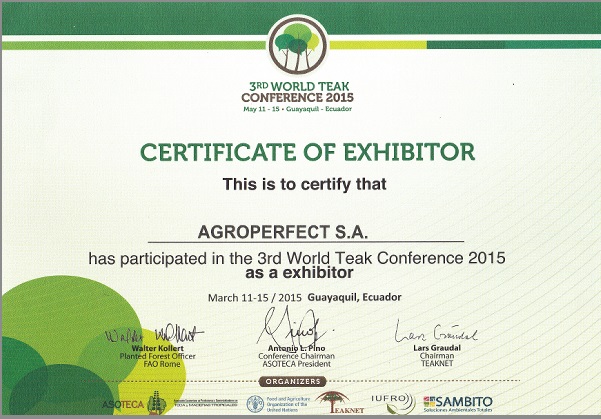 La empresa Agroperfect S.A. participó con productos desarrollados en investigación científica principalmente con minerales procesados como Azufre liquido micronizado, silicio de potasio líquido y coadyuvantes para incrementar la producción de teca mejorando la calidad.