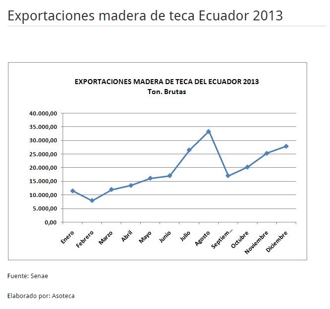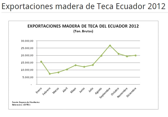 Según datos otorgados por Asociación Ecuatoriana de Productores y Comercializadores de Teca y Maderas Tropicales – ASOTECA, Ecuador es el país número uno en exportación de ese rubro a nivel mundial; ha producido 45.000 hectáreas de teca registradas y exportó aproximadamente 294.189 millones de kilos en el año 2014.