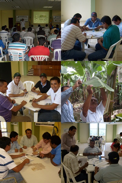 En la foto el Magister José Oñate Investigador científico y experto en Sigatoka negra, comparte experiencias con el Ing. Agr. John Quinteros en un Seminario-Taller práctico sobre Sigatoka negra para los socios del Colegio de Ingenieros Agrónomos en su amplia sede, ubicada en Machala, Ecuador