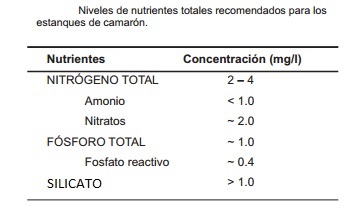 El objetivo de la dosificación de fertilizantes en piscinas de cultivos camaroneros es de lograr concentraciones de nutrientes apropiados para el crecimiento de algas. Relación nitrógeno 1.3 ppm y fósforo de 0.15 ppm. Villalón (1991).