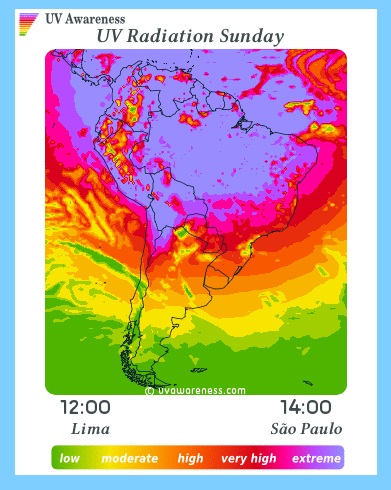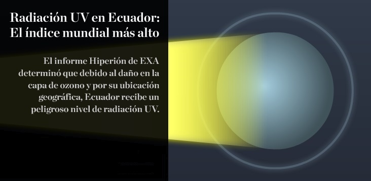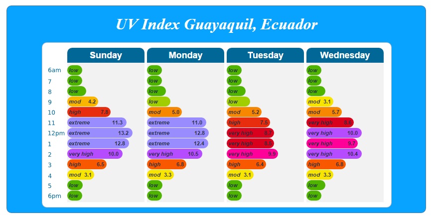 Radiacion UV-B en Ecuador desde las 10 am hasta las 4 pm nivel 14. Normal es 2 y Maximo 6 para el ser humano sin consecuencias.