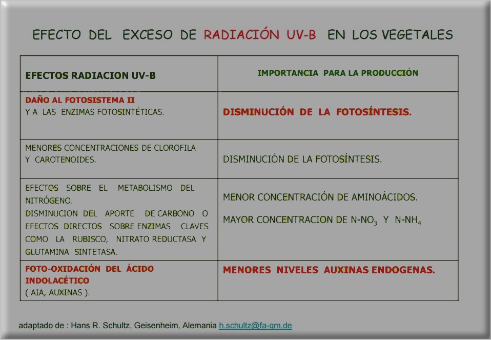 El impacto de UV-B en las capacidades morfológicas y fisiológicas de las plantas ha sido extensamente estudiado, encontrando que el disminuye el crecimiento de las hojas (Tevini y Teramura, 1989)
