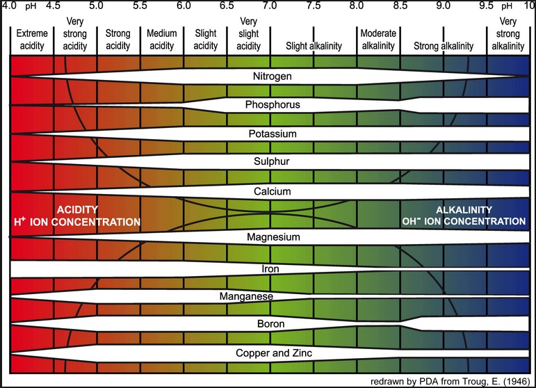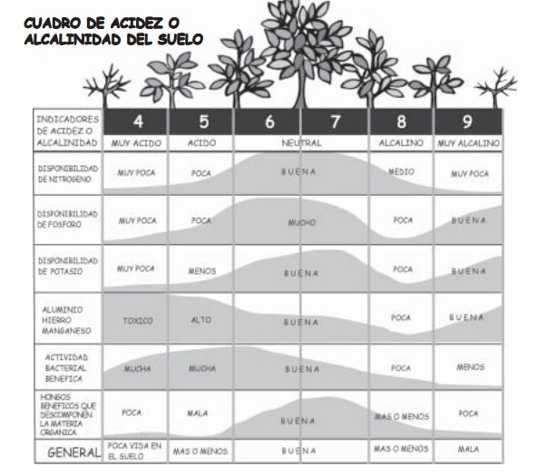 Un cuadro presentado por Cornell.edu informa que en general un cultivo cuyo pH del suelo, se encuentra cercano a 6.5 Proporcionará recursos para facilitar la asimilación de nutrientes de la planta facilitando su desarrollo en forma eficiente y económica.