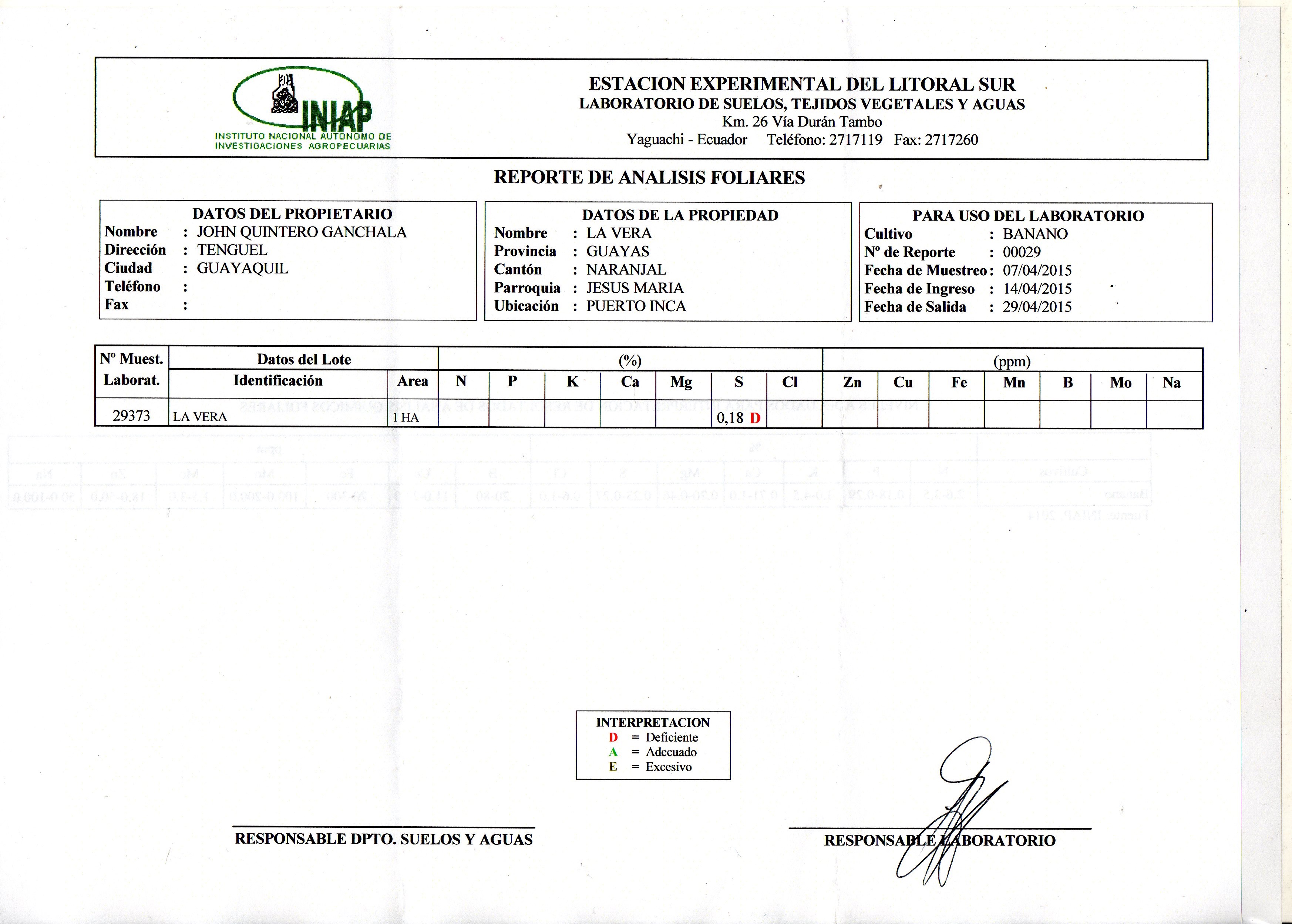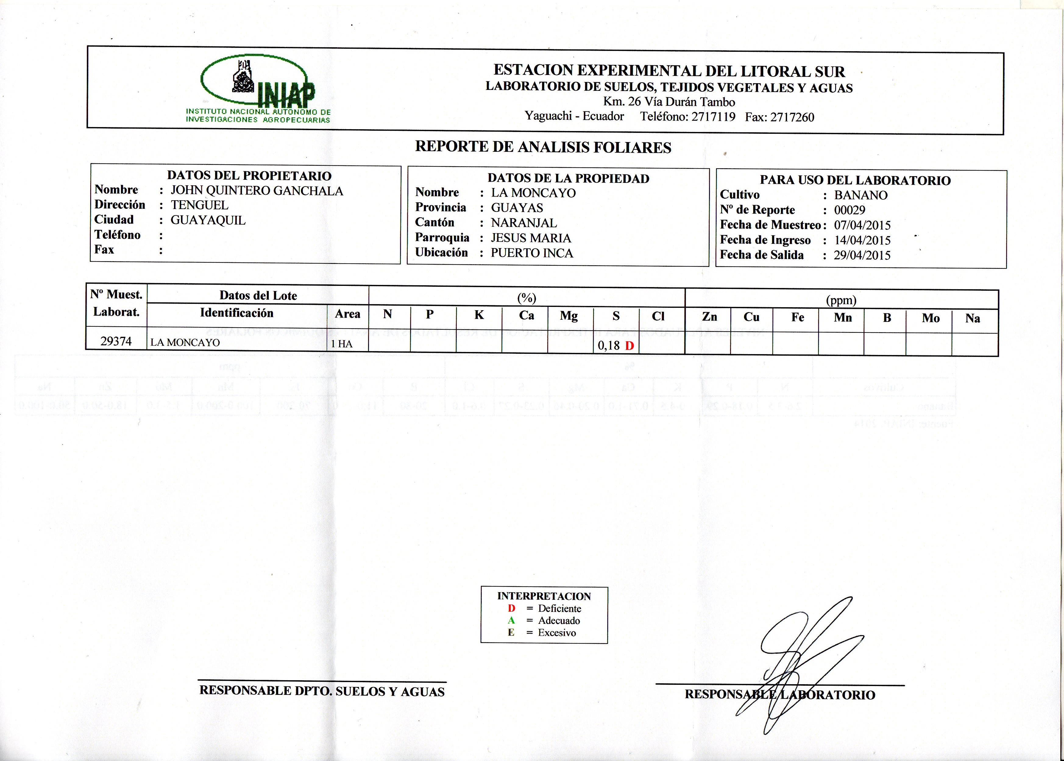 Rango (A)= adecuado de azufre (S) foliar en banano = .23% a .27% ( 2.300 ppm a 2.700 ppm)