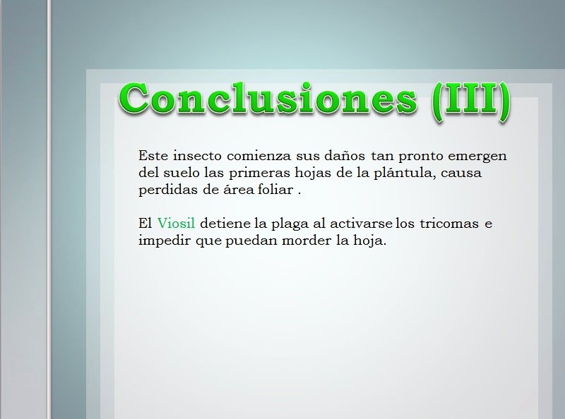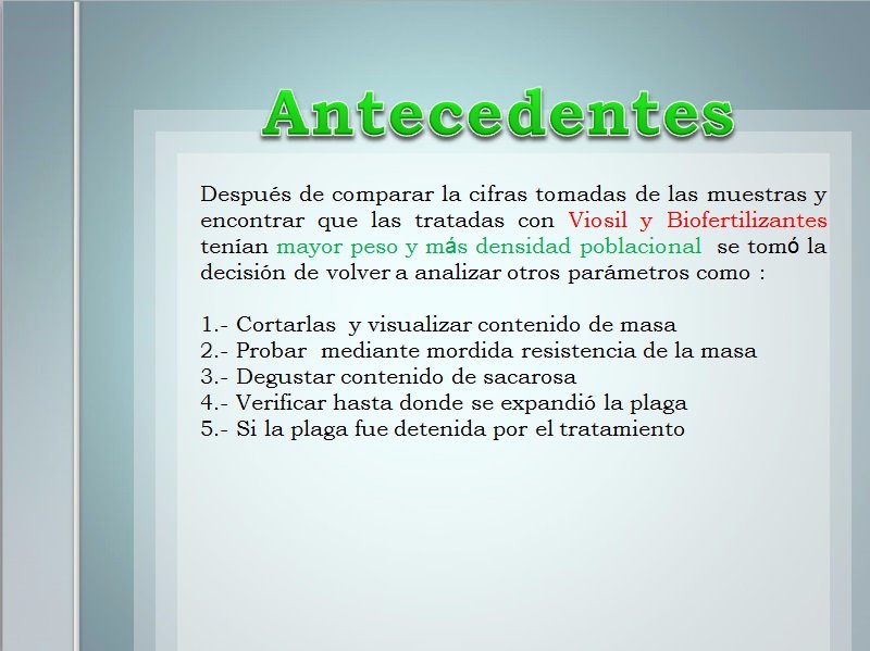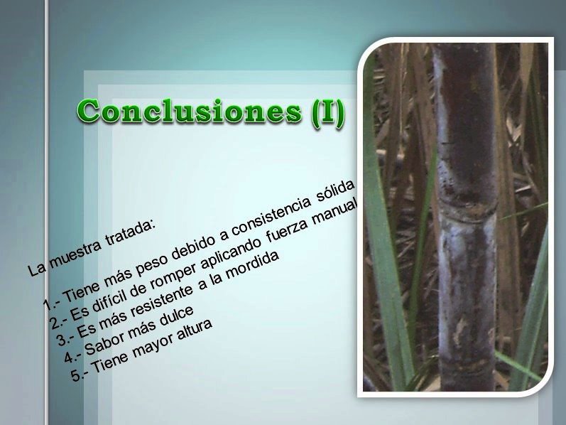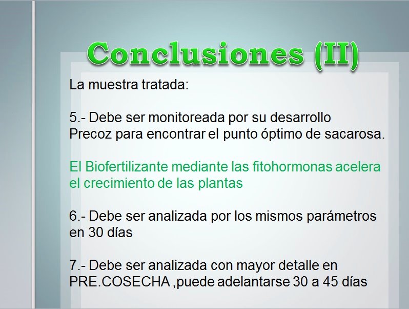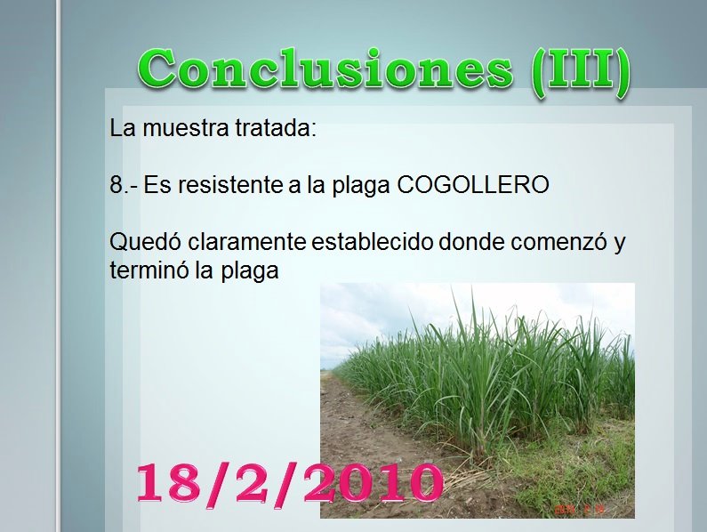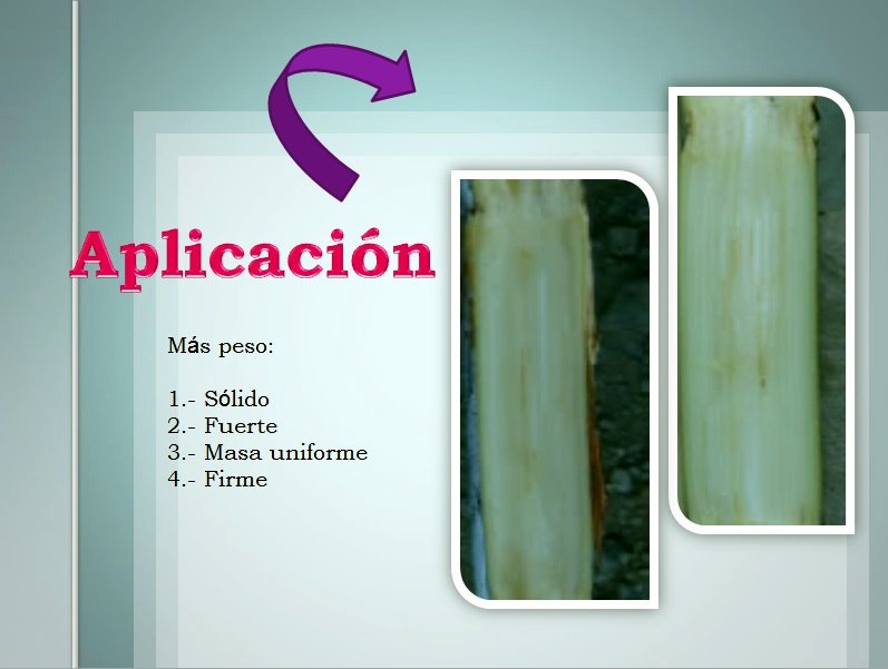 El uso de VIOSIL (Si + K) en un ensayo comercial del cultivo de caña de azucar, muestra incrementos significativos de variables importantes como: Altura,vigor,grados Brix,peso,resistencia a las plagas,etc. Los aspectos mas relevantes son mostrados en las fotografias adjuntas.