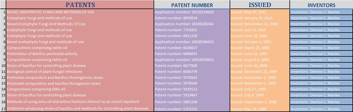 La Dra. Dennis Manker tiene una extraordinaria pasion por la investigacion y el descubrimiento,es un honor publicar algunas de sus numerosas patentes